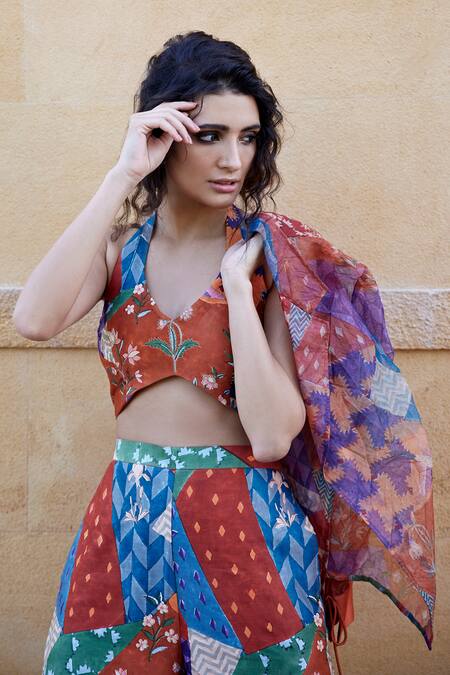 Orange and brown mixed print jacket featuring a notched lapel collar and bishop sleeves. Paired with a sleeveless halter neck bustier and printed flared pants with side pockets.
