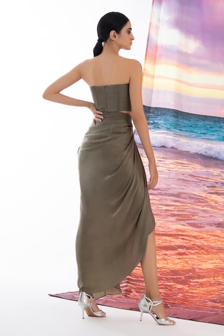 Green Viscose Round Neck Corset And Draped Skirt Set
