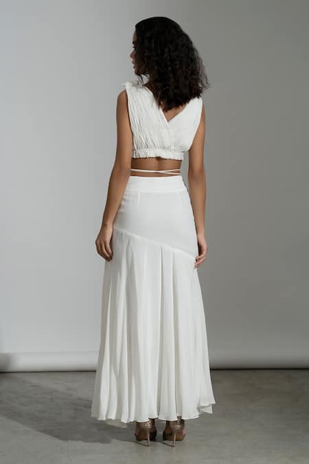White crop top featuring ruched detailing and fray hem. Paired with a high slit skirt with tie-up details and attached lining.