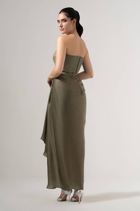 Moss green padded bustier featuring floral beaded embroidery. Paired with a draped skirt made from 100% viscose satin with attached lining.