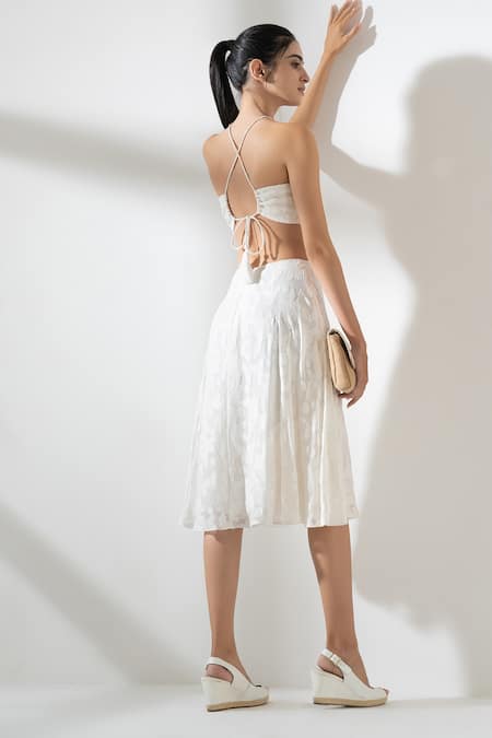 Ivory Viscose, Ramie Embroidery Halter Neck Cut Out Midi Dress