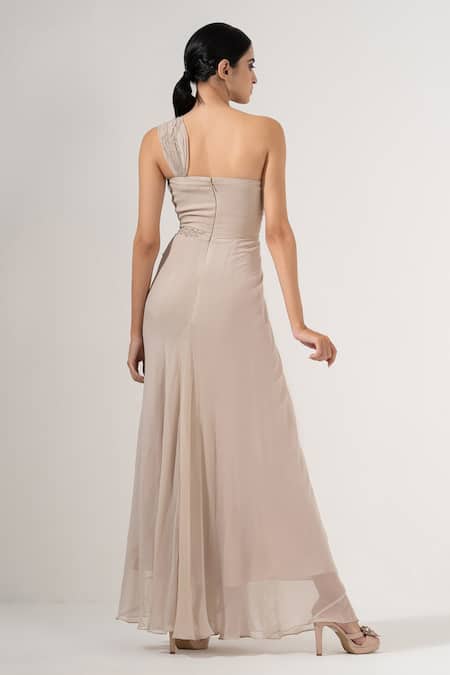 Dirty neutral gown featuring a plunging neckline and one shoulder design