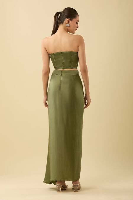 Green corset featuring lace embellishment and strapless design. Paired with an asymmetric draped skirt with a back zip closure.