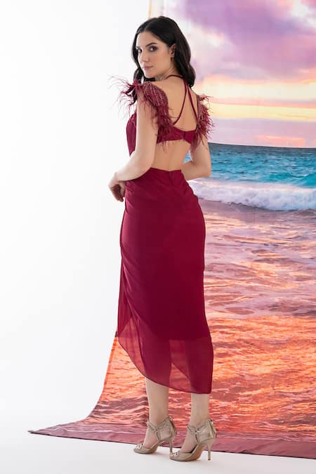 Buy_Amrta By Guneet Kondal_Maroon Chiffon, Viscose Beads Halter Neck Ruched Cutout Asymmetrical Dress _Online_at_Aza_Fashions