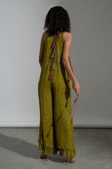 Green jumpsuit featuring a halter neckline with ruffle and braid detailing