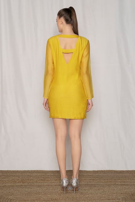 Aspen gold yellow short dress featuring full sleeves and a back deep V neck