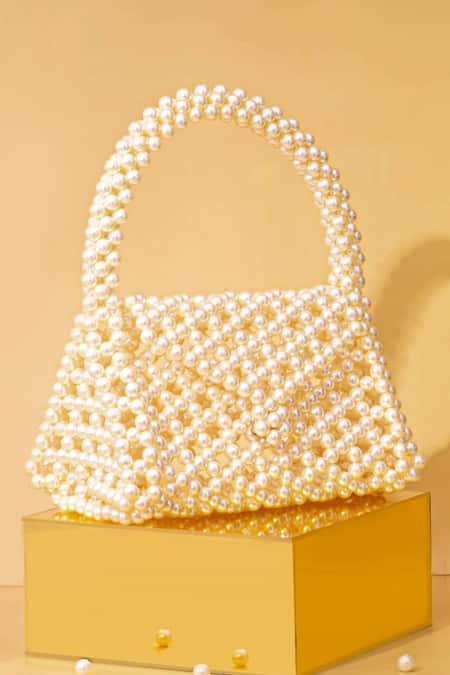 Off white triangular handbag embellished with pearls and featuring an attached pearl handle