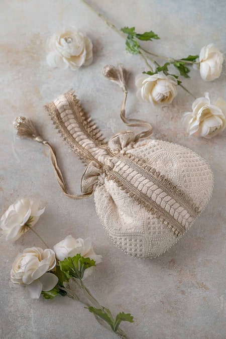White potli bag made of georgette featuring intricate thread embroidery and sequin work