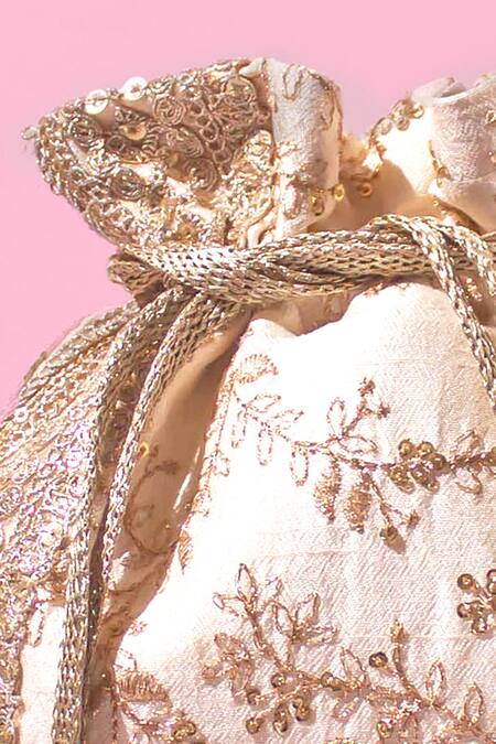 Cream potli bag featuring intricate floral embroidery and pearl tasselled embellishments
