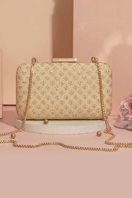 Gold box clutch featuring sequins embroidery and a metal lock closure. Includes a detachable sling for versatile carrying options.