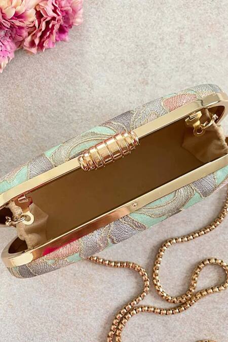 Mint green clutch featuring floral embroidered motifs with a gold metal frame