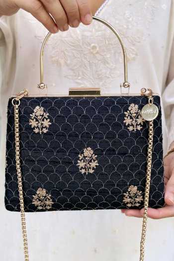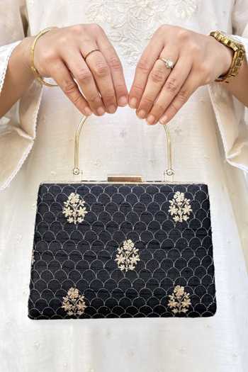 Black clutch with scallop-pattern embroidery and intricate floral motifs. Crafted on a richly textured base, it pairs well with ethnic and fusion ensembles for festive and evening occasions.