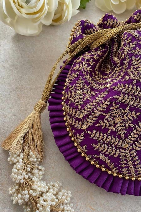 Purple potli bag featuring intricate embroidery with woven gold thread drawstrings and handcrafted tassels