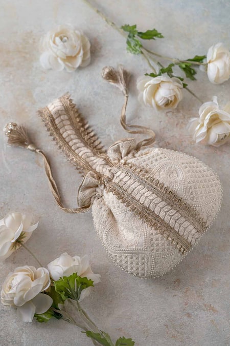 White potli bag featuring all-over embroidery, embellished beads, and handmade tassels