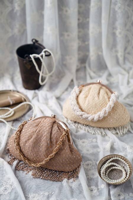 Beige clutch featuring light gold thread floral embroidery, crystal fringe lace, and pearl tassel border