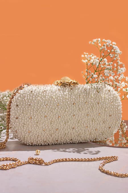 Amyra_White Beads, Embroidery Perla Capsule Clutch _Online_at_Aza_Fashions
