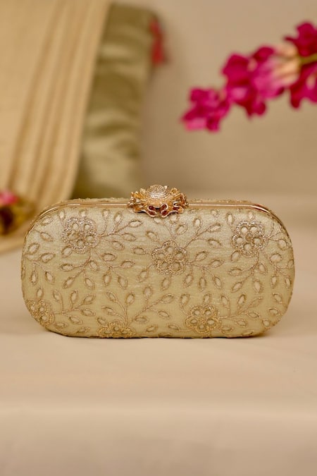 Intricate floral cutwork design, Gold metal frame with embellishments, Detachable sling chain for versatility