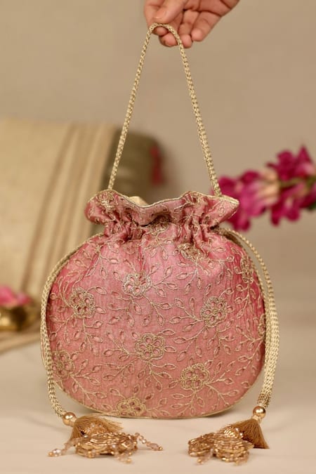 Pink Embroidery, Tassels Tarang Cutwork Potli Bag