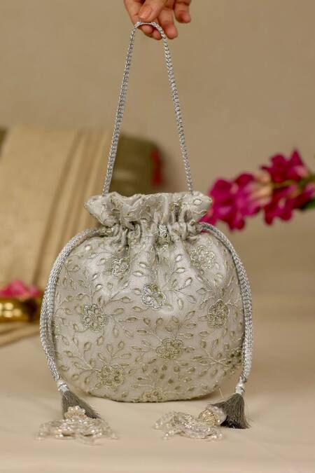 Silver Embroidery, Tassels Tarang Cutwork Potli Bag