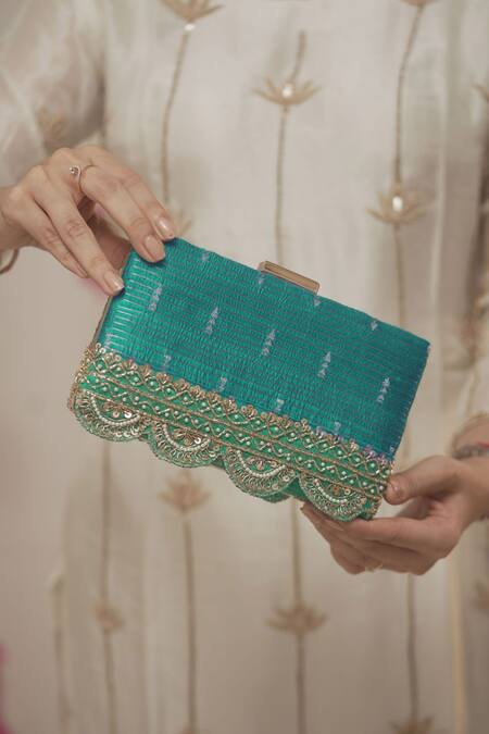 Turquoise silk clutch featuring all over geometric stripe pattern with metallic zari, cut dana, scalloped lace & pearl embroidery. Comes with a detachable gold metal sling chain.