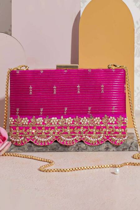 Pink pure silk clutch handcrafted in a structured box shape featuring an all-over geometric stripe pattern. Embellished with metallic zari, cut dana, scalloped lace, and pearl embroidery, it comes with a gold metal detachable sling chain.