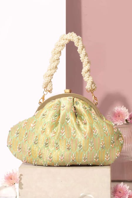 Green Embroidery, Pearls Titli Pure Banarasi Silk Vintage Clutch