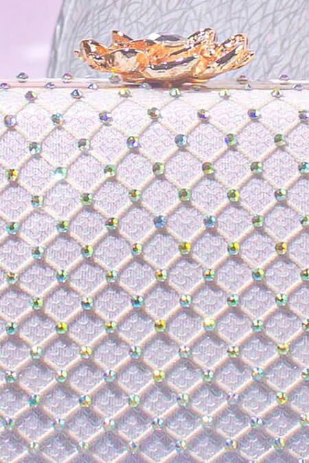 Off White clutch featuring a capsule structured shape, layered mesh fabric, and all-over holographic stone embellishment