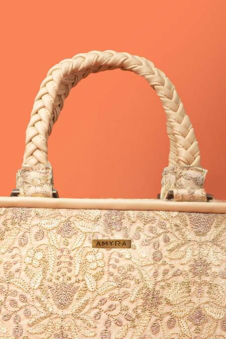 Beige handbag featuring semi silk threadwork fabric with suede lining