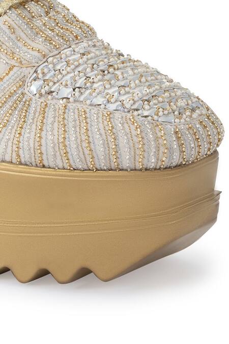 Champagne gold sneaker wedges featuring zardozi embroidery on a striped chiffon base