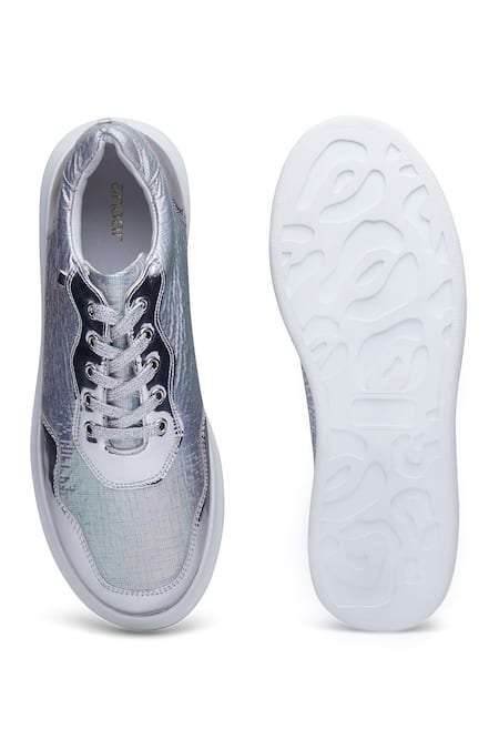 Silver metallic sneakers featuring a textured base and lace-up closure