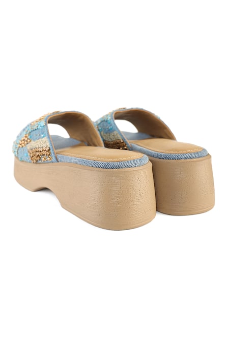 Blue denim sandals featuring embellished upper with intricate beadwork