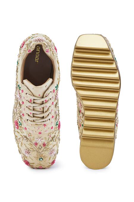 Gold wedge sneakers featuring floral embroidery in pink and green