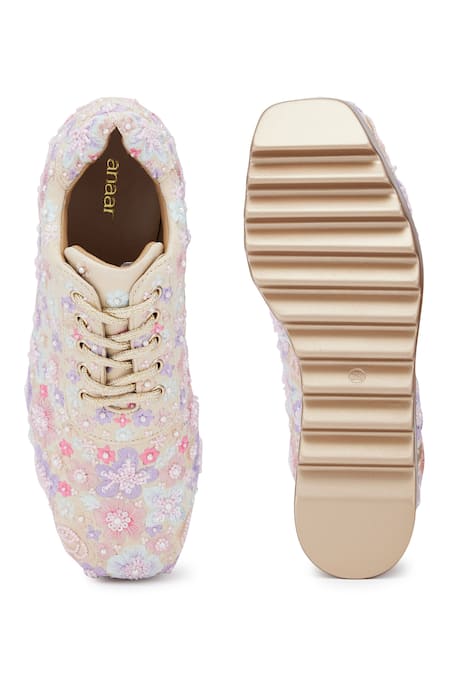 Beige wedge sneakers featuring multicolored resham embroidered floral motifs embellished with pearls, sequins, and beads