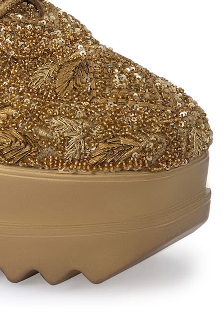 Gold sneaker wedges featuring gota embroidery, gold beads, and sequins embellishments