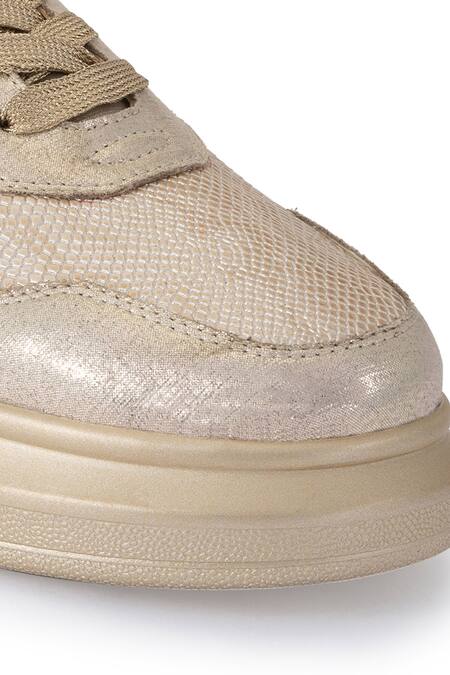 Champagne gold sneakers featuring an all-over geometric pattern and shimmer