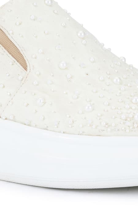 Ivory sneakers featuring all-over pearl embroidery on a poly suede base