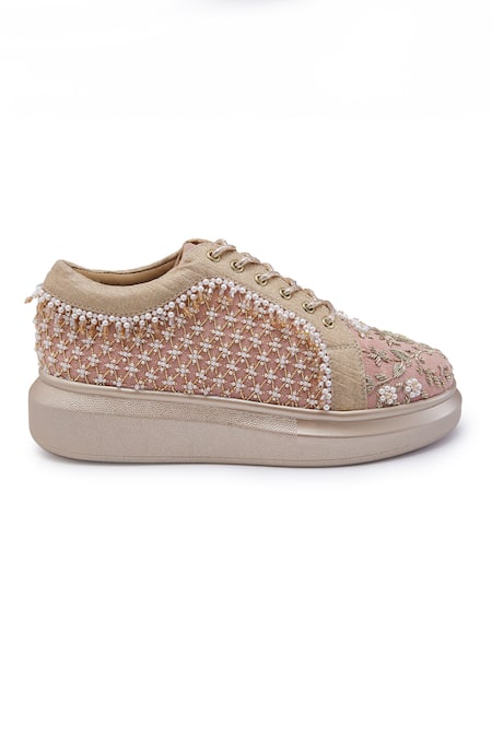 Pink flat sneakers crafted in shimmery micro suede fabric featuring zari detailing, dabka pitta work, and gold pearls in a floral jaal pattern