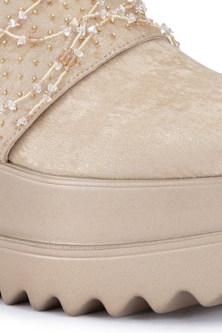 Gold sneaker wedges featuring crystal tassel embroidery on foiled milano satin
