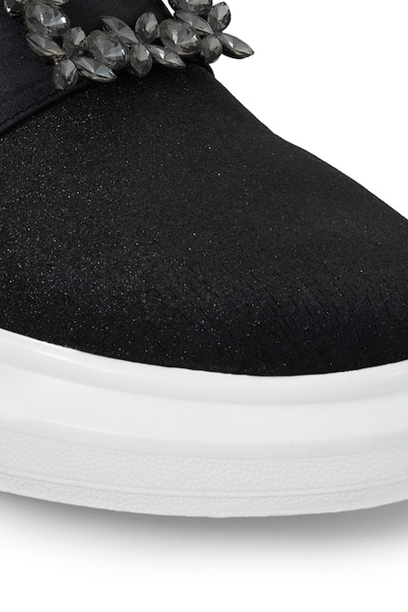 Black sneakers featuring a shimmery base and a buckle embellished with crystals