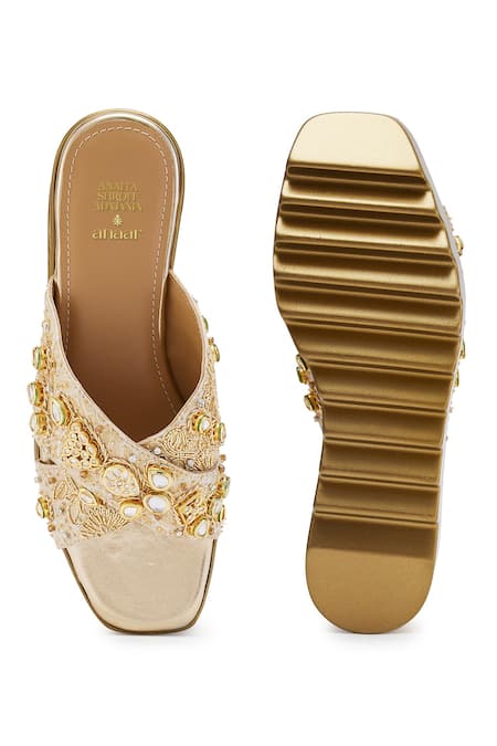 Gold heels featuring jadau embellishments on a brocade base. Designed with a comfortable wedge heel for added height.