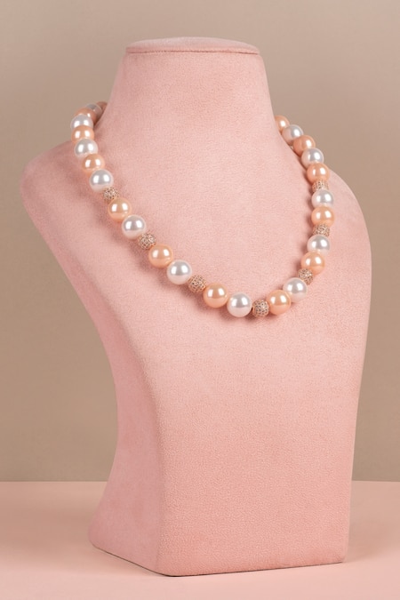 22K gold plated necklace featuring orange and white pearls along with Swarovski embellished beads. The necklace is made from hypoallergenic brass and measures 20 inches in length.
