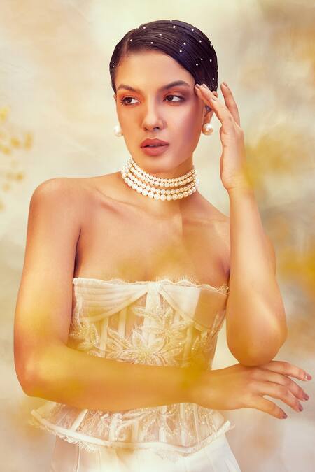 Layered choker featuring white pearl embellishments with a hypoallergenic brass composition