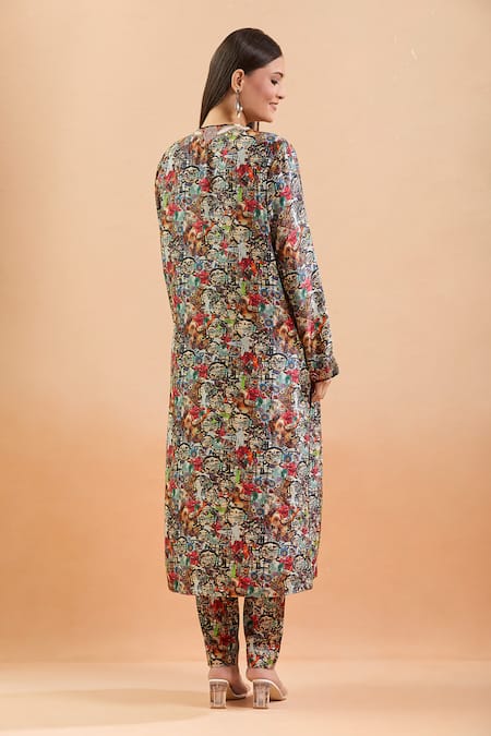 Multi-color straight kurta featuring abstract print with bead and sequin embroidered neck and sleeve hem. Paired with coordinating pant and dupatta.
