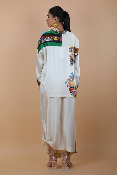 White Silk Collared Abstract Print Shirt And Skirt Set