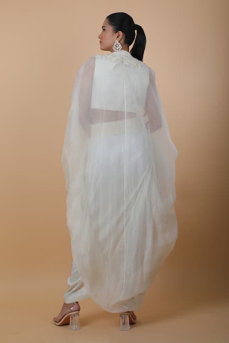 Off-white cape featuring floral, beads, and thread embroidery. Paired with a skirt and a top, both designed for a relaxed fit.