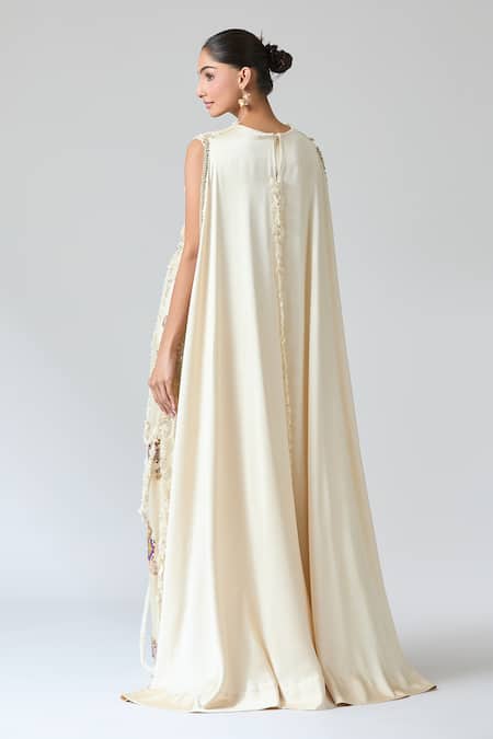 Cream top featuring an attached drape with floral lace, pearls, sequins, and gota patti embroidery. Paired with matching pants adorned with similar embellishments.