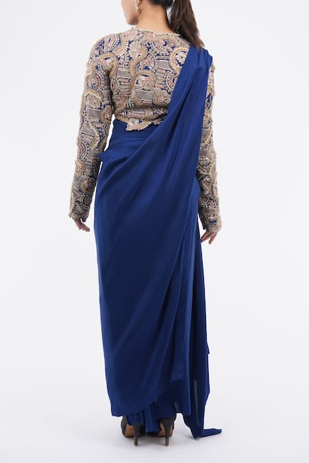 Buy_Anamika Khanna_Blue Embroidery Round Neck Blouse With Draped Skirt Set_at_Aza_Fashions