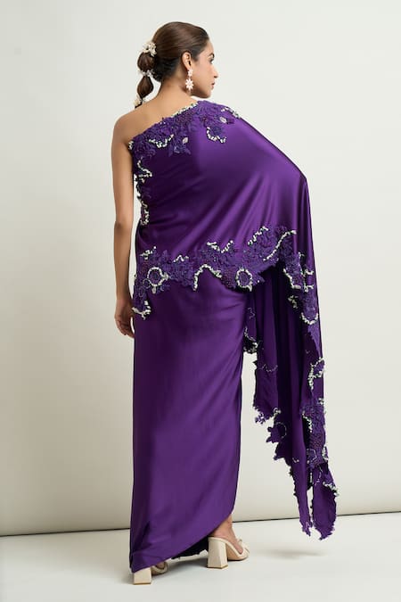 Purple one shoulder cape featuring tonal 3D floral embroidery with pearl work borders. Paired with a coordinating draped skirt.