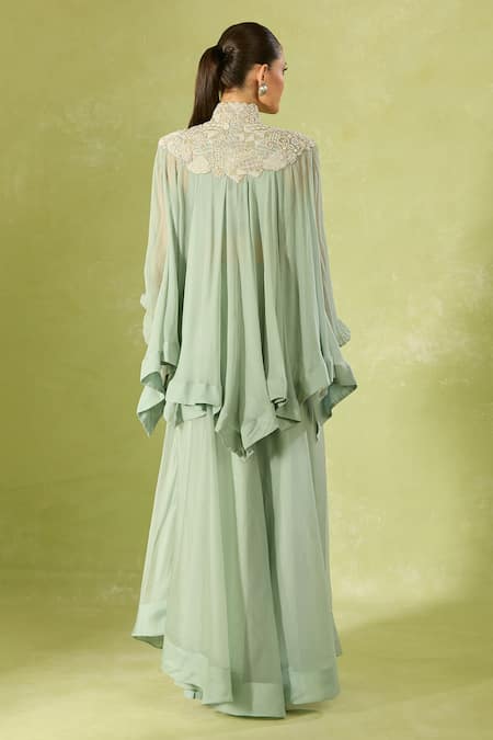 Pale blue tunic featuring intricate embroidery and a high collar. Paired with a matching sharara and an inner slip for added coverage.