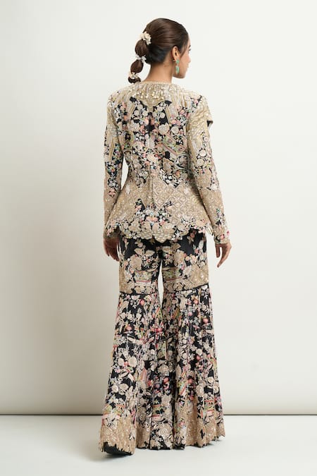 Black peplum jacket featuring multi-colored floral embroidery and cutout details at the sleeves. Paired with a coordinating gharara adorned with similar floral embroidery.